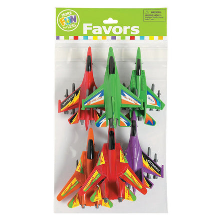 This Jet Fighter Pull Back Toy set is perfect for a party favor. The pack includes 6 fast and fun pull-back jet fighters in a variety of colors. Keep the fun going for hours with these small but powerful jets.